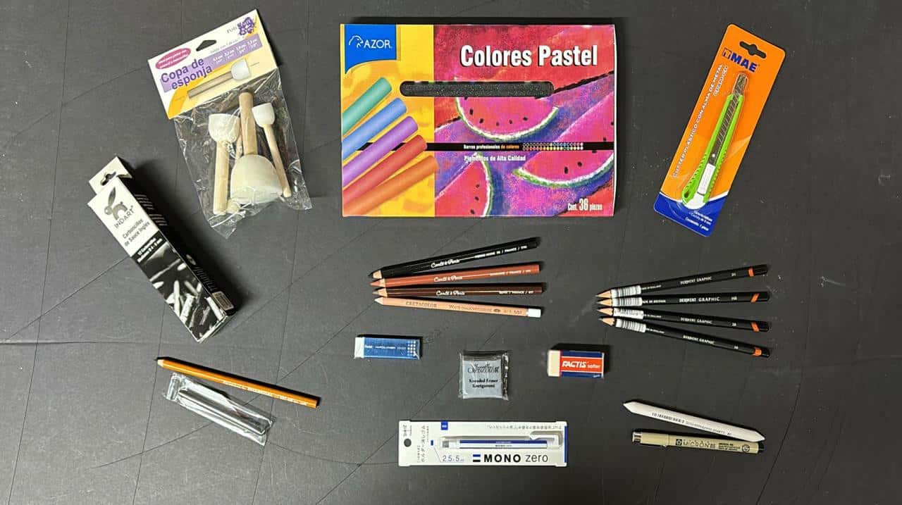 Aprenderemos todo lo de material, todas las tecnicas de dibujo a lápiz de grafito, a carboncillo, sepia y sanguina, como se hace la obra con gises de pastel seco, estilógrafos etcétera.